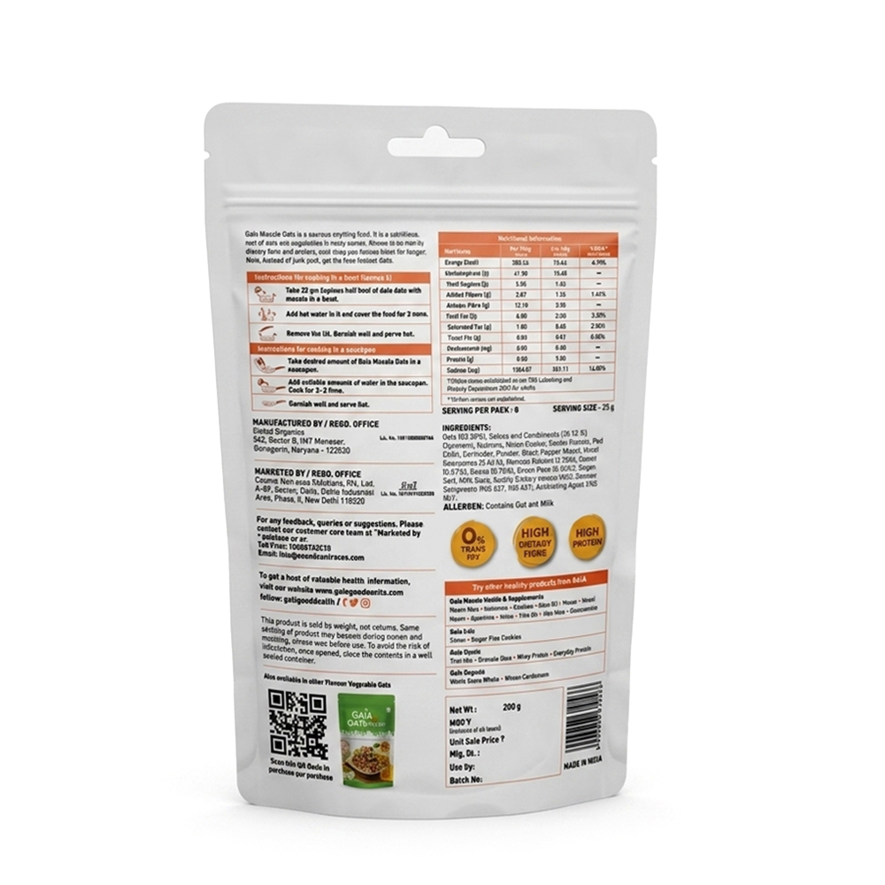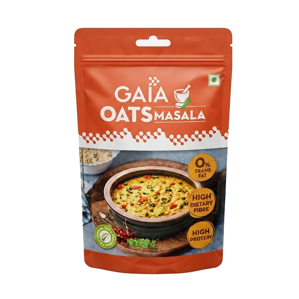 Gaia Oats – Masala is the perfect balance of health and taste that would keep you fuller for longer. Packed with the goodness of oats and vegetables in zesty spices, Gaia Masala Oats is a savoury anytime food. Known to be rich in dietary fiber and protein, oats keep you feeling fuller for longer thereby, helping you manage weight. Besides, they are known to be good for the health of your heart too. Now, instead of junk food, opt for Gaia Masala Oats with its unbeatable combination of good health and delicious taste.