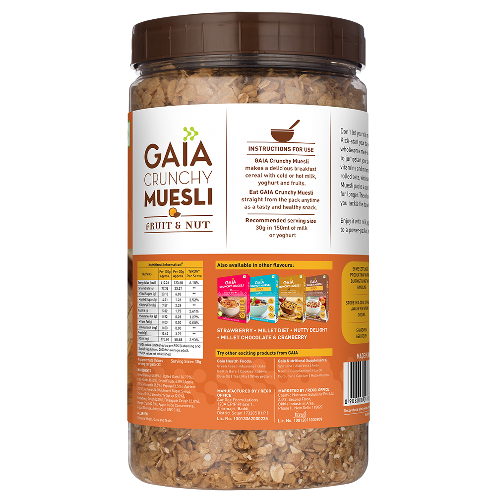 Gaia Crunchy Muesli - Fruit & Nut is a nutritiously satisfying meal-in-a-bowl that has succulent pieces of fruits and nuts. It is a source of nutrients such as fiber, protein, iron, vitamins, minerals, and anti-oxidants.