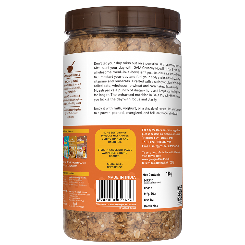 Don’t let your day miss out on a powerhouse of enhanced nutrition! Kick-start your day with GAIA Crunchy Muesli – Fruit & Nut. This wholesome meal-in-a-bowl isn’t just delicious, it’s the perfect way to jumpstart your day. And fuel your body and mind with essential vitamins and minerals. Crafted with a satisfying blend of high-fibre rolled oats, wholesome wheat, and cornflakes. GAIA Crunchy Muesli – Fruit & Nut packs a punch of dietary fibre and keeps you feeling fuller for longer. The enhanced nutrition in GAIA Crunchy Muesli helps you tackle the day with focus and clarity.